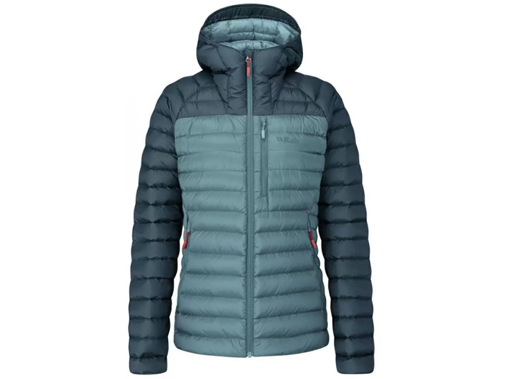 Péřová dámská bunda Rab Microlight Alpine s kapucí vyrobená z nylonové tkaniny Pertex Microlight je plněná kvalitním husím prachovým peřím 750 Cuin 90/10 s hydrofobní úpravou Nikwax.