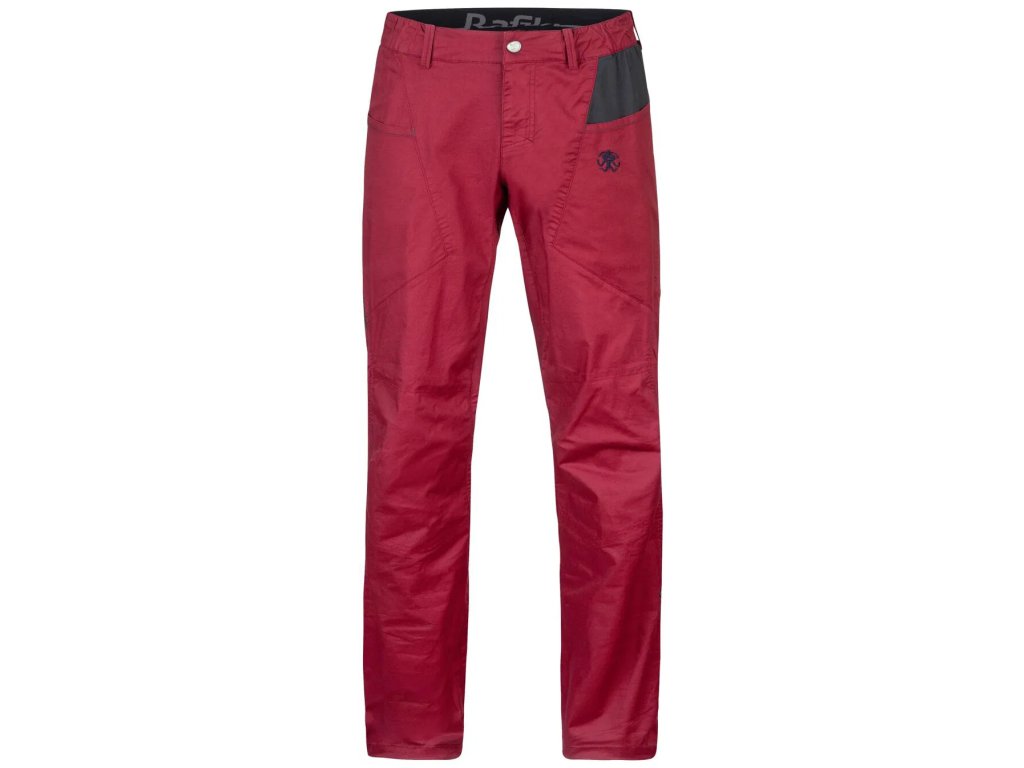 Pevnější, ale pružný materiál z bavlny a elastanu, zdvojená anatomicky tvarovaná kolena. Propracovaný střih nebrání pohybu. Prostorné přední kapsy, kapsička na kartáček a kapsička se zipem na boku. Kalhoty mají poklopec, gumu v celém obvodu i poutka na pásek.