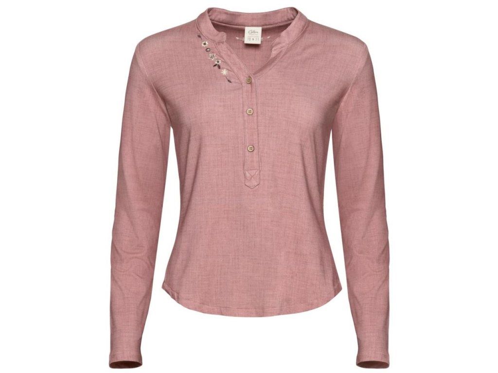 Košile má krátké zapínání na knoflíky, jemnou dámskou originální výšivku a u krku nízký stylový stojáček.