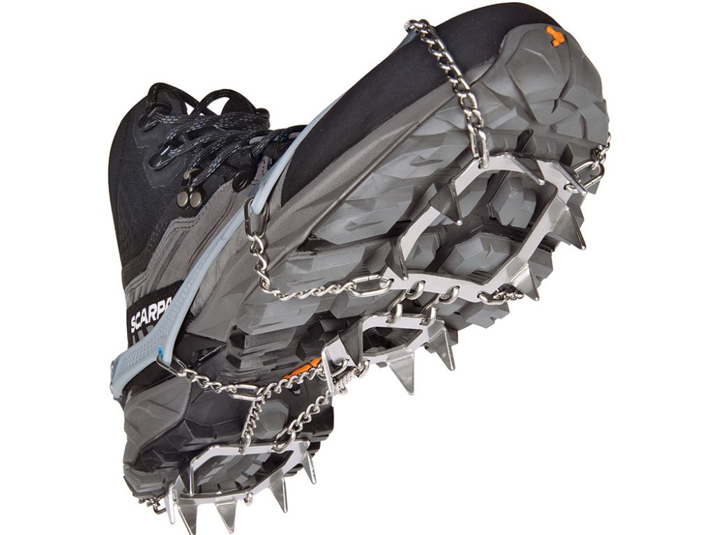 Ice Master Pro jsou lehké, univerzální nesmeky se 16ti ocelovými hroty o délce 15 mm ideální pro bezpečnou chůzi na zledovatělém terénu. Díky inovativnímu dvoumateriálovému upínacímu systému se nesmeky dokonale přizpůsobí obuvi, k tomu nabízí vysokou stabilitu a jistý pohyb. Tuhé plotny s 16 nerezovými hroty o výšce 15 mm zajišťují maximální trakci, boční stabilitu i brzdný účinek, zatímco jejich odlehčená konstrukce udržuje celkovou hmotnost na minimu. Přední hroty jsou navíc kloubově uchycené, takže se přirozeně přizpůsobí pohybu boty i členitému terénu. Součástí balení je kompaktní pouzdro, které chrání hroty a zároveň zabraňuje poškození další výbavy při transportu.