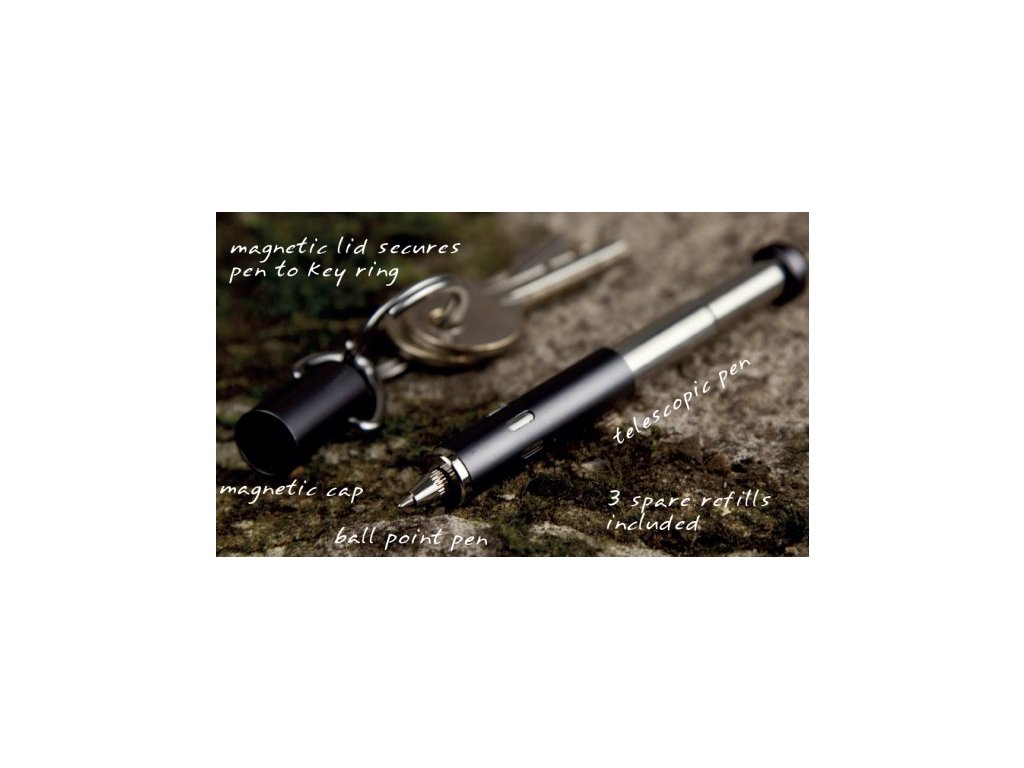 Teleskopické pero je patentovaným společníkem dovaší kapsy. Jednoduše se odpojí od svého silného magnetického víčka a rozšiřuje se na celou délku pouze jedním remorkérem. Dejte klíč na klíčenku a vždy budete mít po ruce plnohodnotné a pohodlné pero. Vyrobeno z teleskopických tub z nerezové oceli a eloxovaného hliníku vnějšího pláště. 3x náhradní černé náplně v ceně.