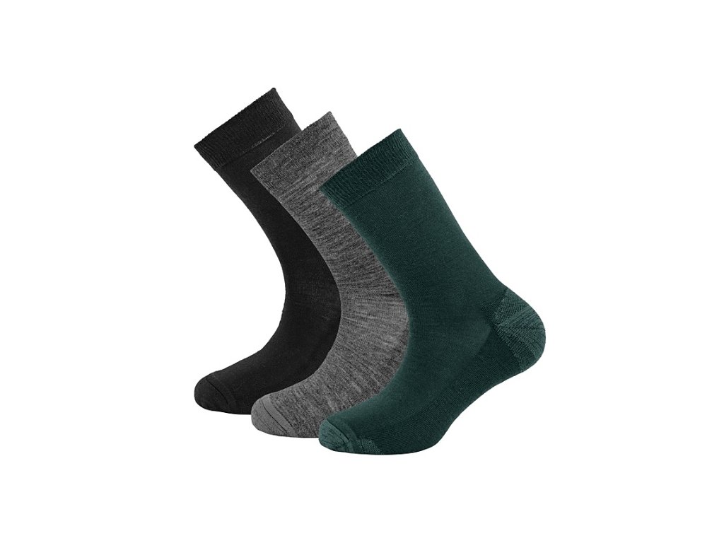 Balení 3 páry silnějších univerzálních vlněných ponožek Devold Daily Medium . Ponožky mají pohodlný lem, zesílenou patu a špičku pro delší životnost, vypodložený nášlap pro větší pohodlí a tepelnou izolaci.
