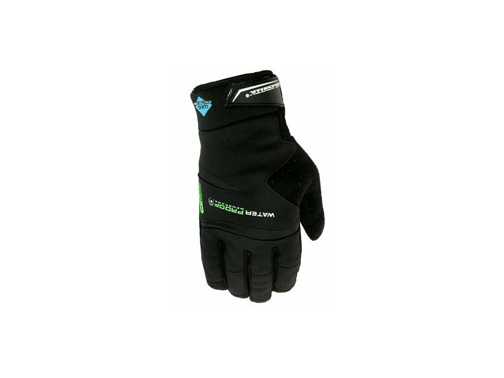 Dlaň: syntetická kůže, tepelná izolace, protiskluzový silikonový potisk, gelové vycpávky, neoprénová manžeta kolem zápěstí