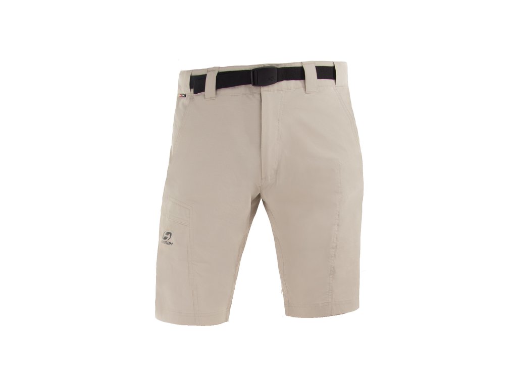 Pánské funkční outdoorové šortky HannahSten jsou vyrobené z pevné lehké elastické nylonové tkaniny Aft Ripstop s elastanem, která je rychleschnoucí a výborně prodyšná, s UV úpravou. Kraťasy mají dvě hlavní přední kapsy v pase, jednu kapsa na stehně a jednu kapsu vzadu, všechny jsou na zip. Obvod pasu se dá regulovat páskem