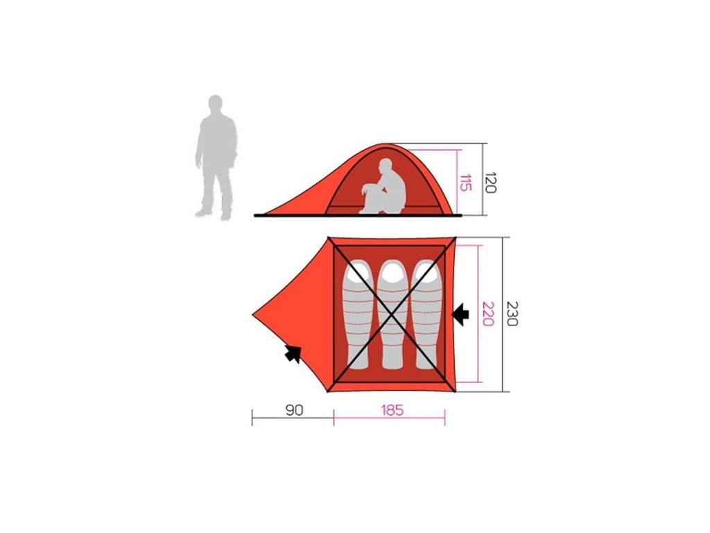 Rozměry vnitřního stanu ( loýnice ) šířka 185 cm x délka 220 cm x výška 115 cm