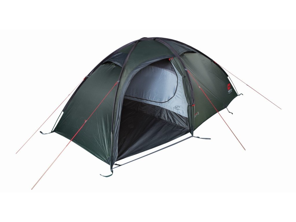 Stabilní dvouplášťový samonosný stan Hannah SETT 3 s vnější duralovou konstrukcí, pro 3 - 4 osoby nebo pro rodinu se dvěma malými dětmi má jednu velkou prostornou předsíň s dvěma bočními vchody.