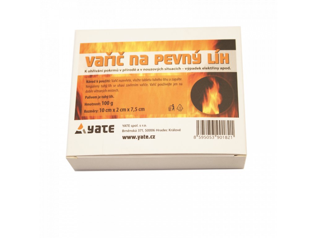 Malý, lehký a skladný vařič Yate na tuhý líh vhodný pro tramping, kempování a turistiku. Složí se do malé krabičky.