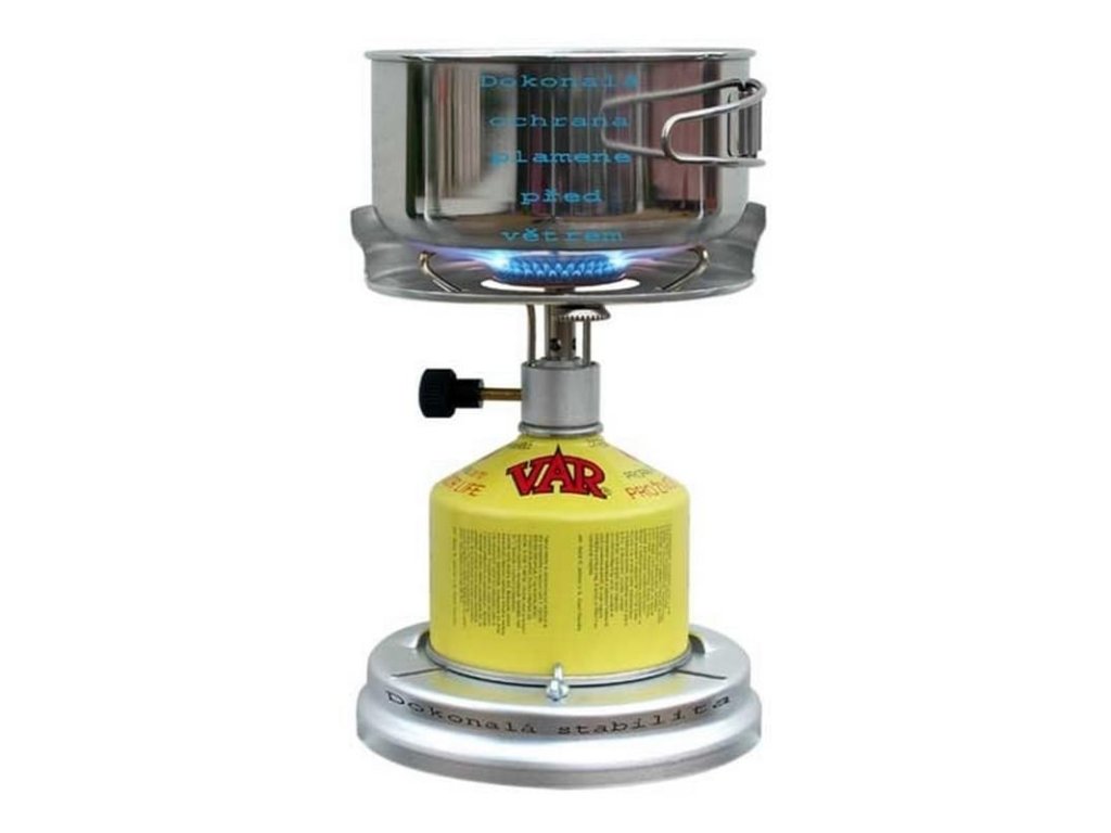 Důležitým doplňkem vařiče VAR 2 je odnímatelné závětří, které je nově vytvořeno tak, aby mohlo v opačné poloze posloužit jako stabilizační podložka soustavy kartuše - vařič. Za větrného počasí dopomáhá ke značné úspoře paliva, až 25%! Závětří ochrání plamen před poryvy větru a reflexní plocha odráží teplo spalných plynů pod varnou nádobu. Nasazení a sejmutí je velmi snadné, vařič zůstává i nadále skladný a lehký.